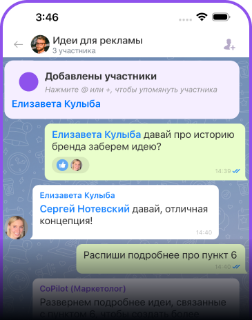 Теперь вы можете добавлять CoPilot в групповой чат и вместе достигать большего. Подключайте AI к обсуждению, вместе придумывайте, пишите, уточняйте, сокращайте и тут же согласовывайте.