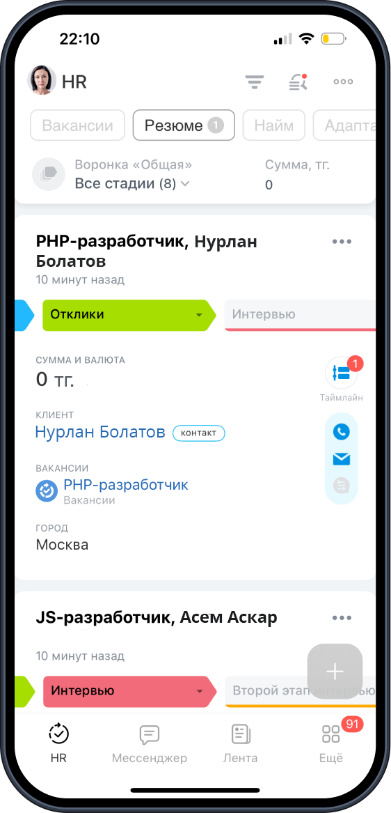 Весь процесс будет расписан по шагам. Каждый этап найма — это стадии на канбане. У каждого кандидата — своя карточка. Перемещайте карточки по стадиям, и система будет сама отправлять сообщения, создавать документы и многое другое.